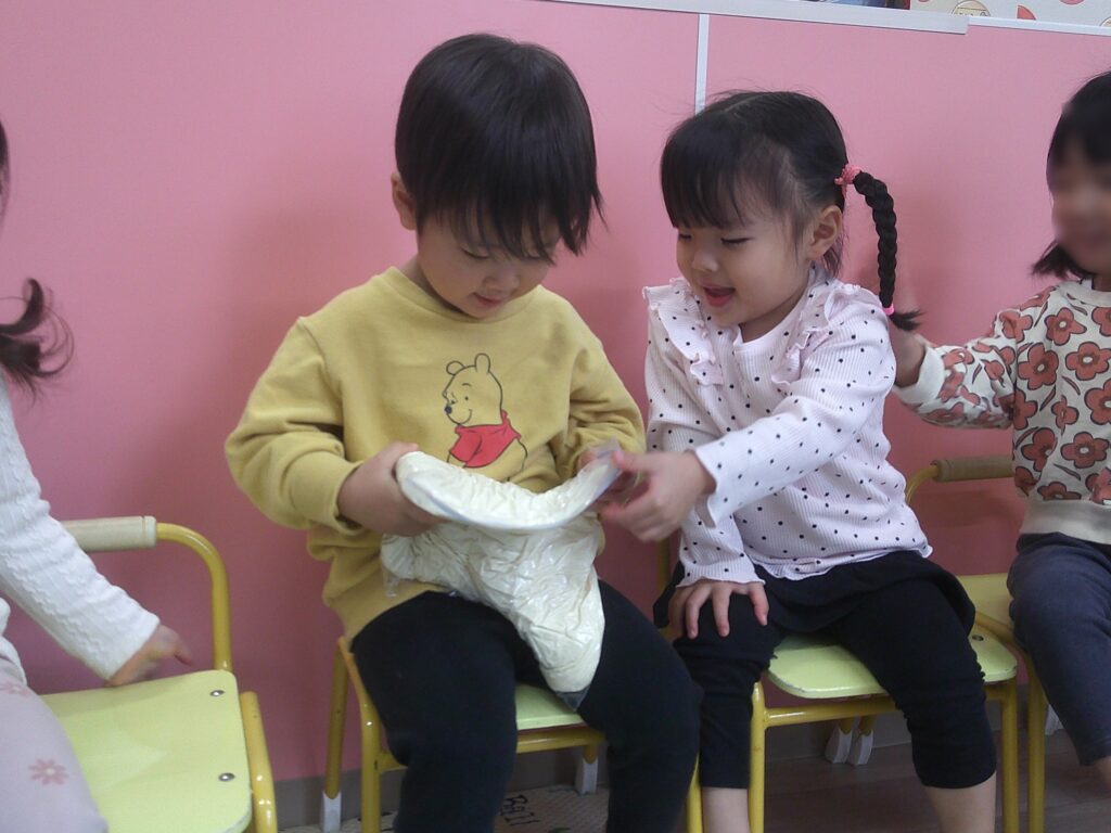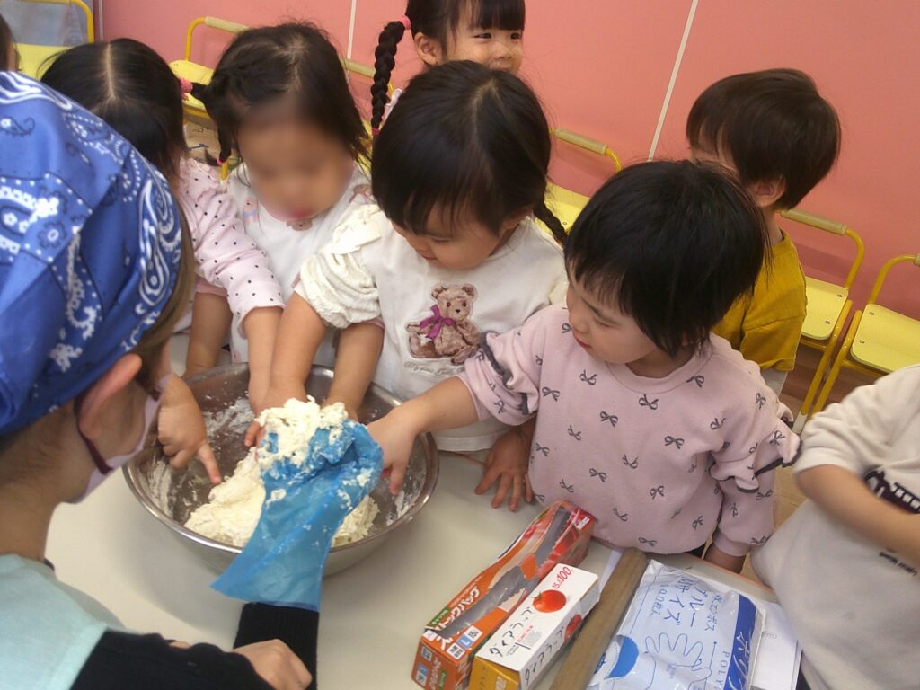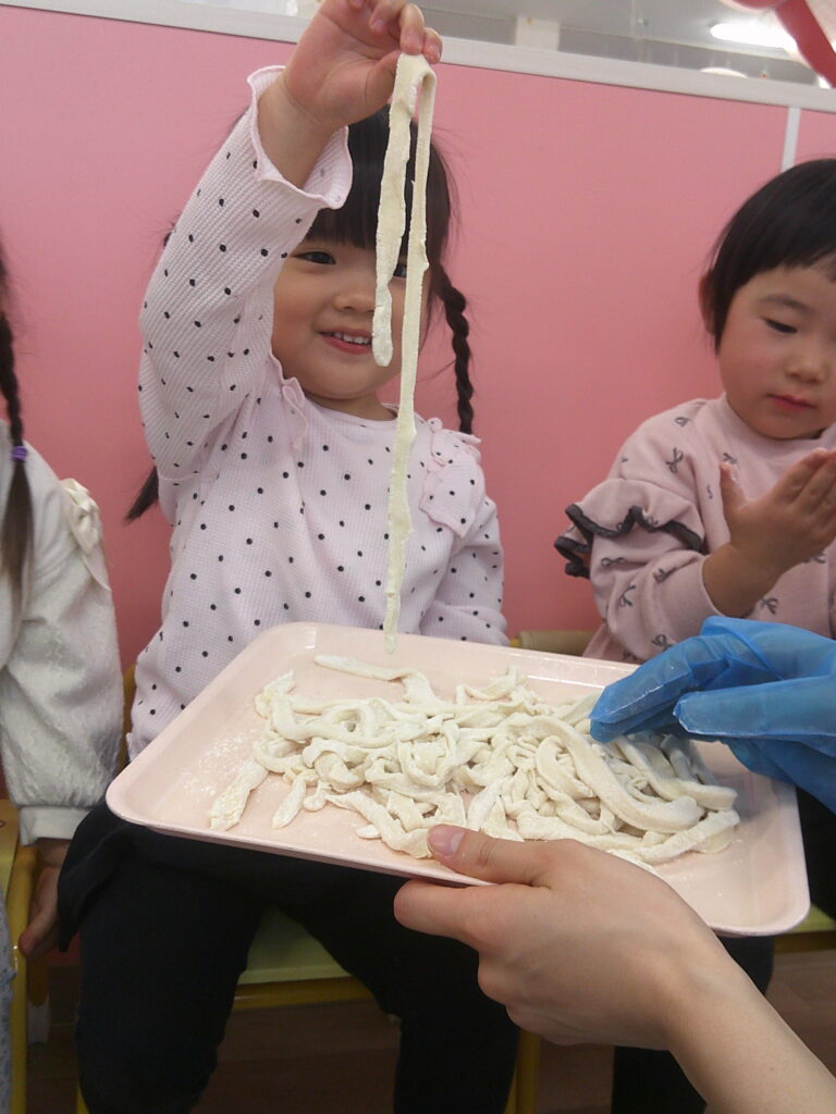 2歳児トパーズクラスの今月の食育はうどん作りです🍜