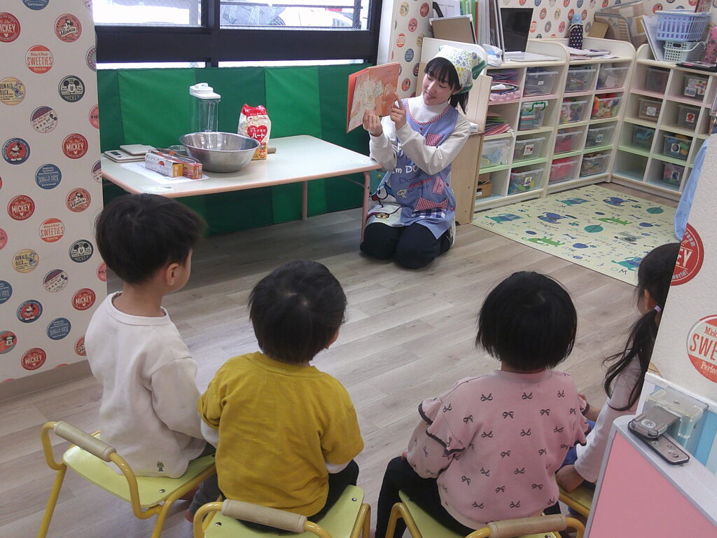「絵本には何が出てきたかな?」と聞くと「小麦粉!」「お水!」と口々に教えてくれたトパーズさんです。