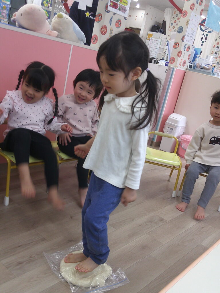次は順番に、足で踏んでみます。いよいようどんを作っている感じがしてきましたね!