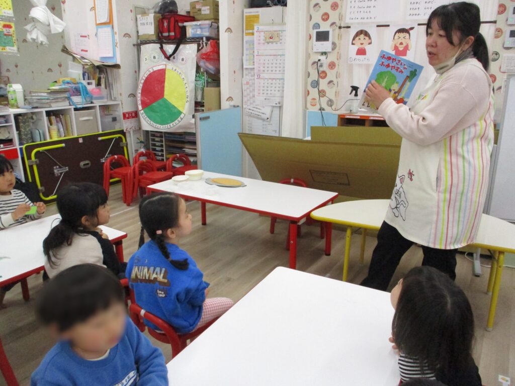 次に、先生から冬野菜の紹介です。絵本に何が出てきたっけ?これ知っている!など、たくさん意見が聞こえました。