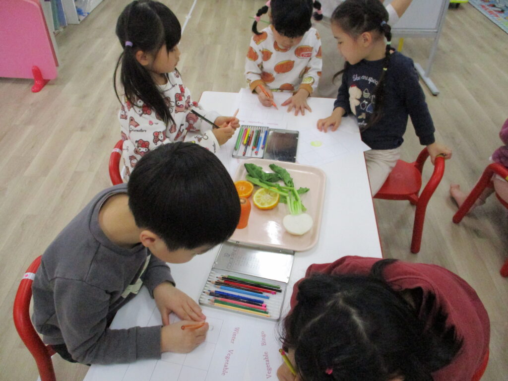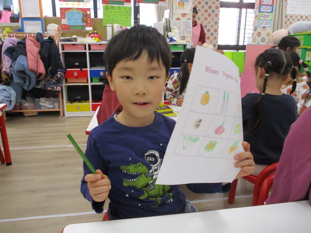 さて、4歳児エメラルドクラス、5歳児ダイヤモンドクラスも冬野菜の食育を行いました。