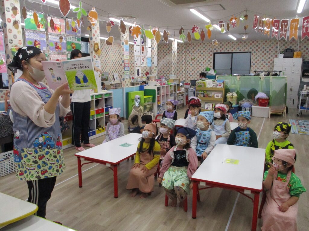 始めに「こめつぶ丸のごはんができるまで」の絵本を読んで、お米ができるまでにどのくらい時間がかかるのかを学びます。