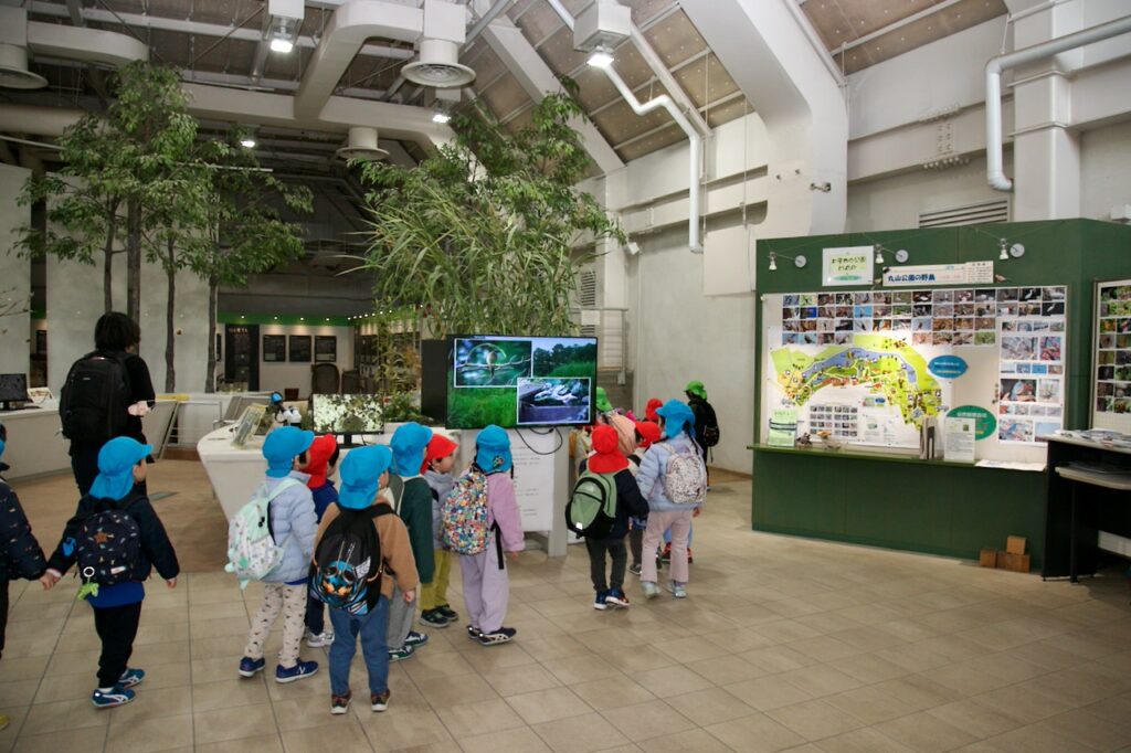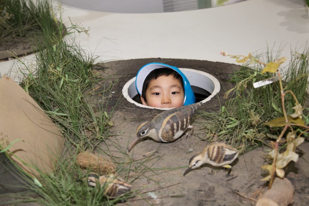 まず最初に自然学習館に行きました。ここには実際に上尾市で見つかった植物や生き物がたくさん展示されていました。ヘビやカブトムシ、鳥などをみて子どもたちは大興奮でした!