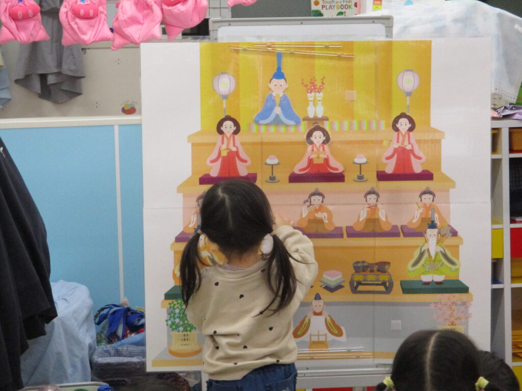 先生が用意してくれた大きなひな壇に、お雛様などの雛飾りをみんなで考えてつけていきました✨