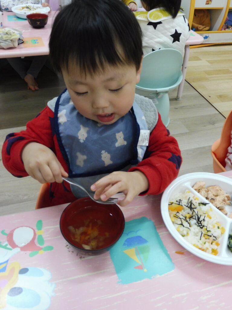 すまし汁の花麩に興味津々!?の子どもたち。にんじんもお花の形で華やかなランチタイムでした🌸