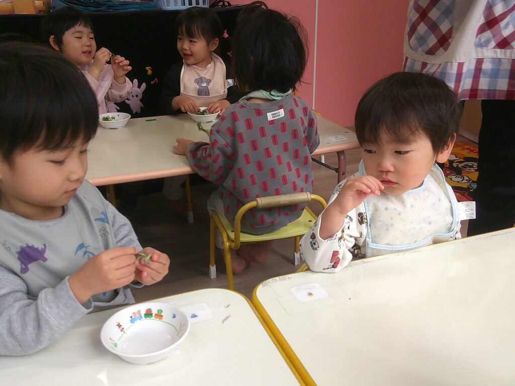 触ってみたり、においをかいだりして、お正月を五感で感じた子どもたちです。