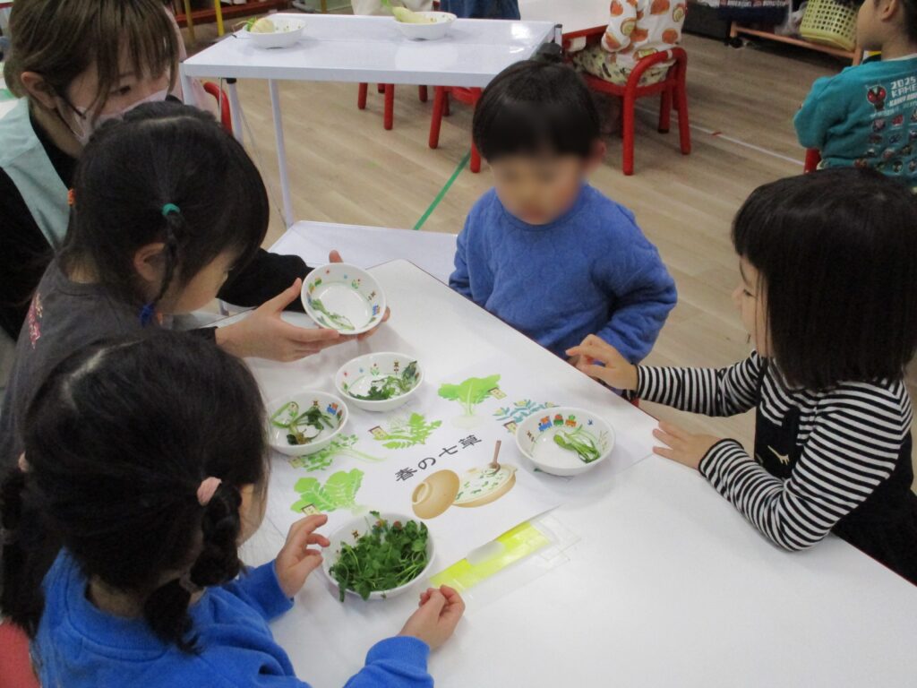 栄養士の先生が、おかゆにする前の七草を持ってきて紹介してくれました🍃