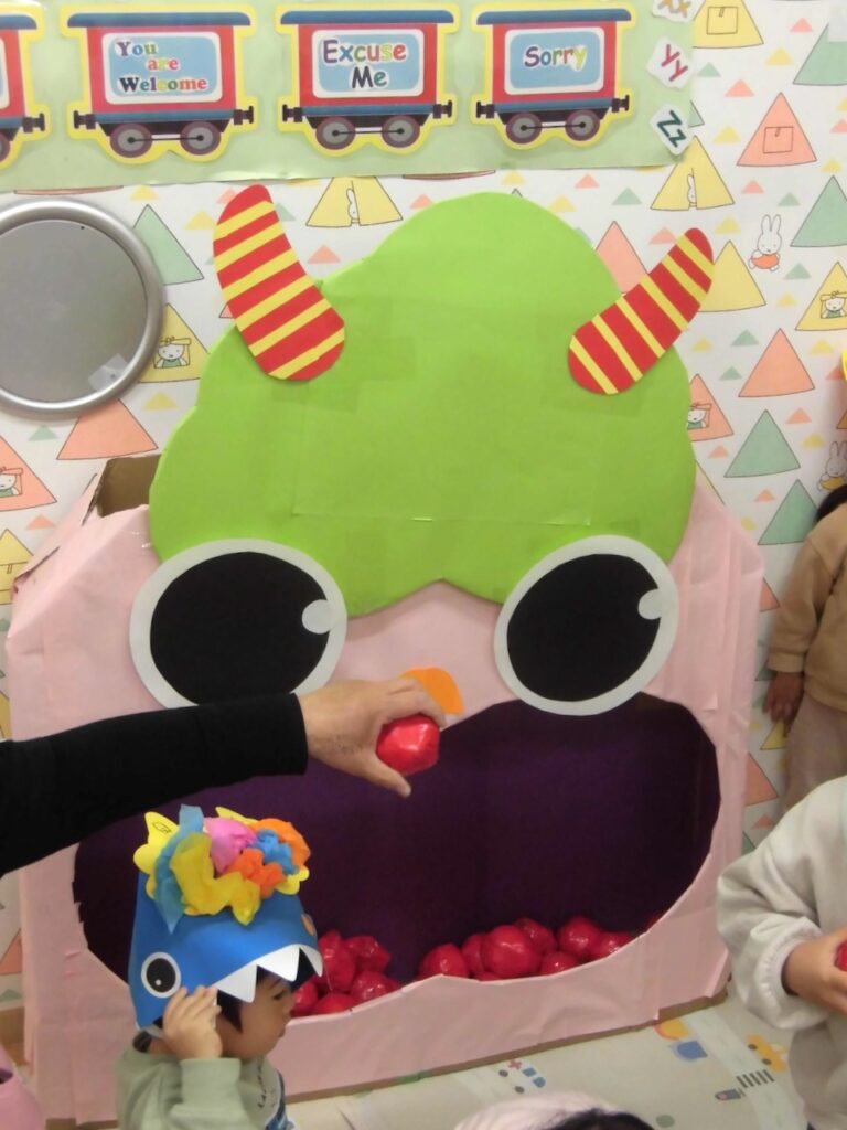ナーサリーさんのお部屋には大きな鬼さんのお口も登場し、みんなで “Lucky Ball” を投げ入れました。キンダーさんは大盛り上がりでボールが飛び交い鬼さんもタジタジに😅これでまた1年、園や皆のおうちにもたくさんの幸福が来てくれることがとても楽しみです✨
