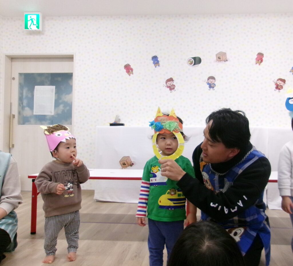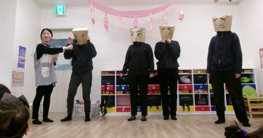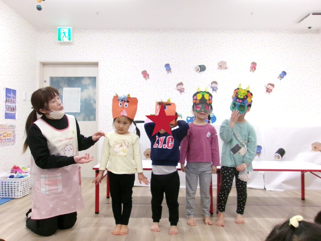 制作した鬼のお面や帽子を披露した後は鬼の登場👹