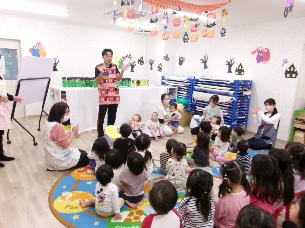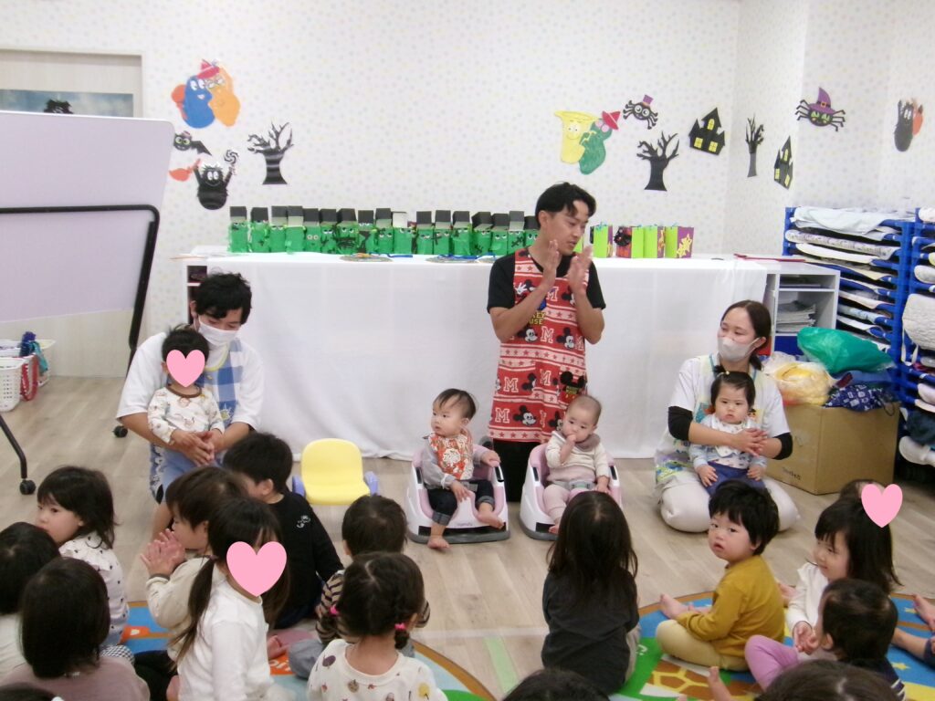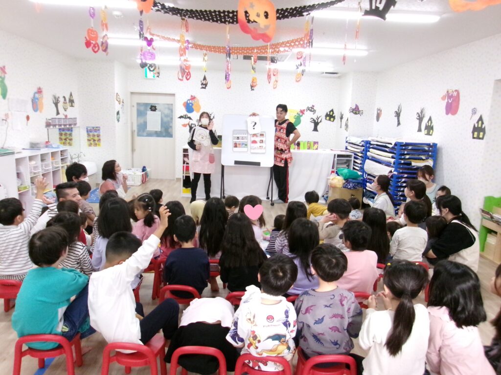 先生たちからの出し物は「くいしんぼうおばけ」のクイズでした。冷蔵庫に入っているものは何だろう?「Let me try!」と手をあげて答えてくれました。最後は大きなケーキが出てきて、誕生児のお祝いをすることができました。すてきな一年になりますように💖