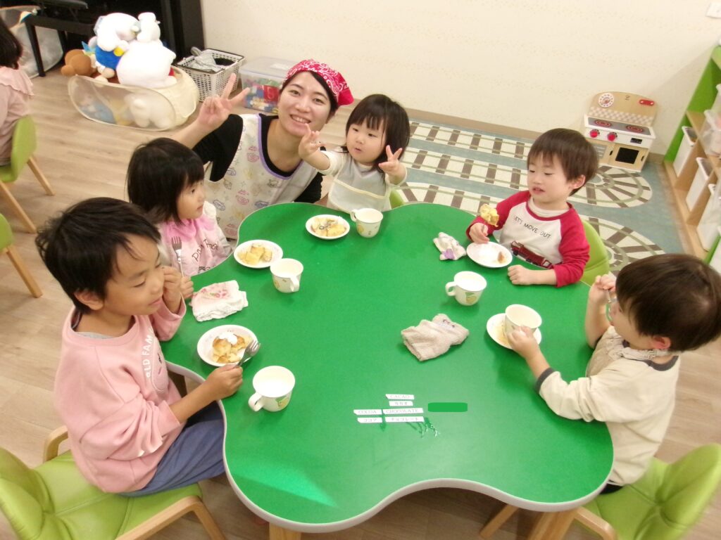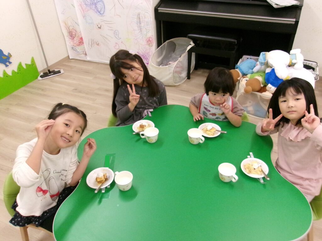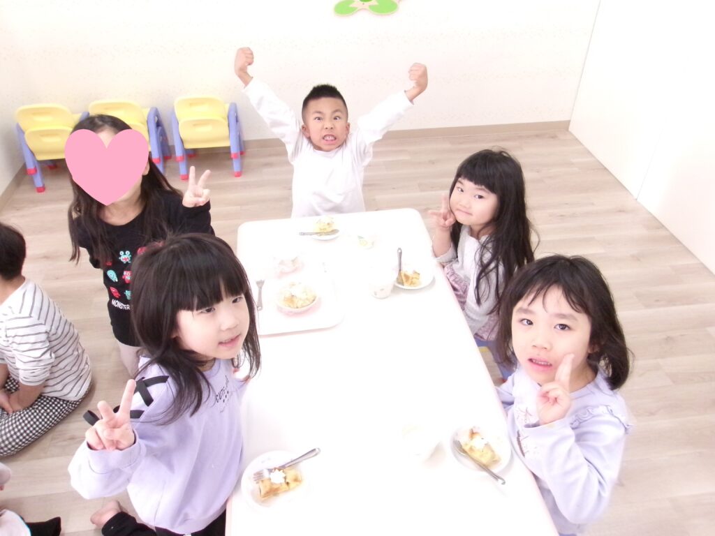誕生会が終わってから、ルビー、トパーズのお部屋でみんな一緒におやつを食べました。兄弟で仲良く座る姿にほっこりしました。