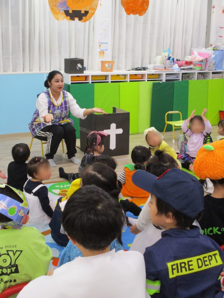 Halloween集会では、英語講師の先生による歌やお話がありました。