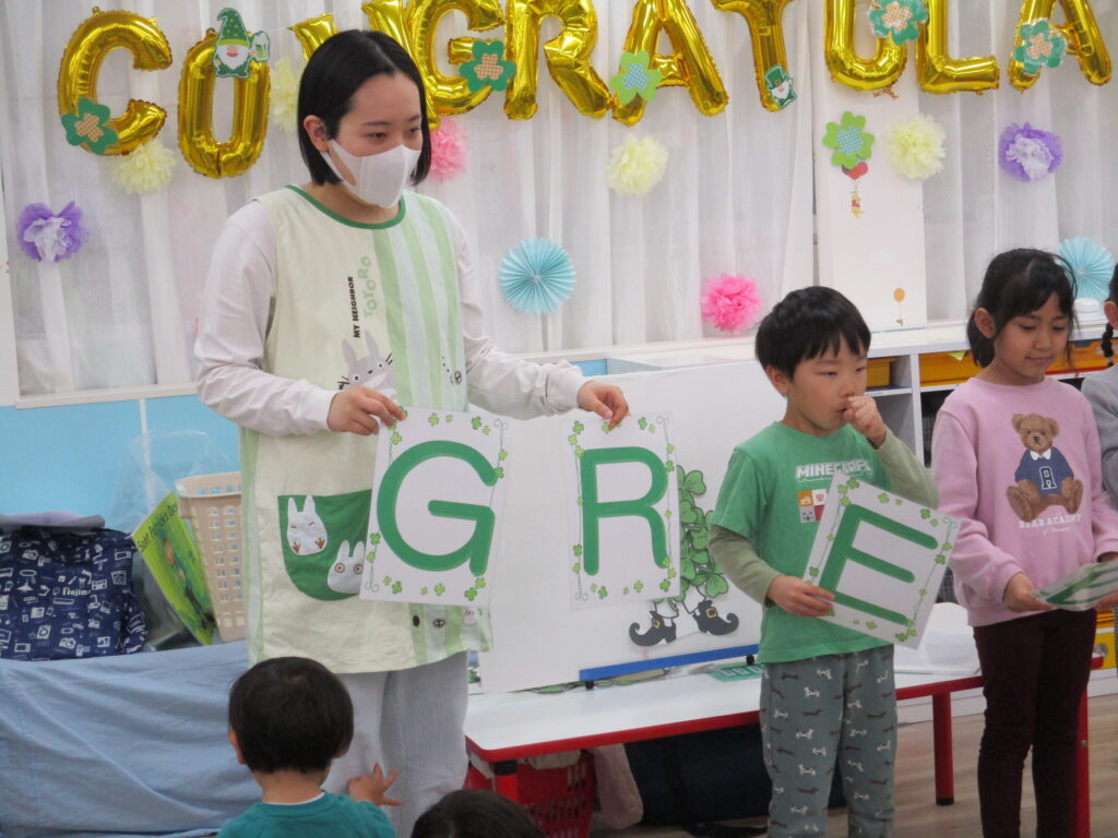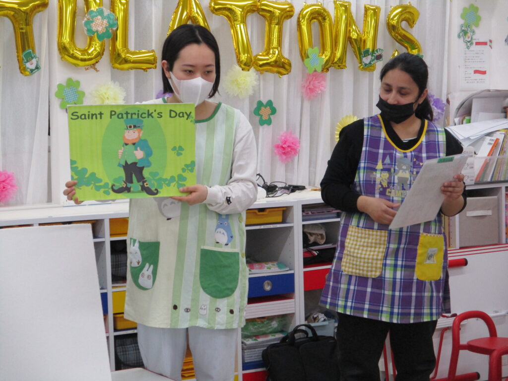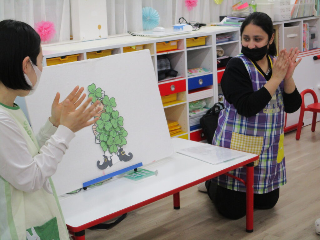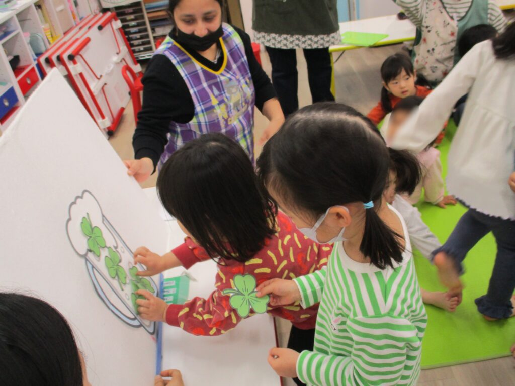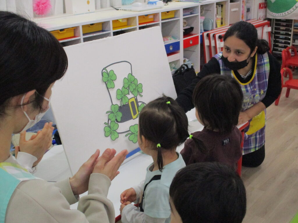 今年は園児全員が、シャムロックと呼ばれる三つ葉のクローバーを持って緑にしていくパネルシアターのアクティビティがありました☘